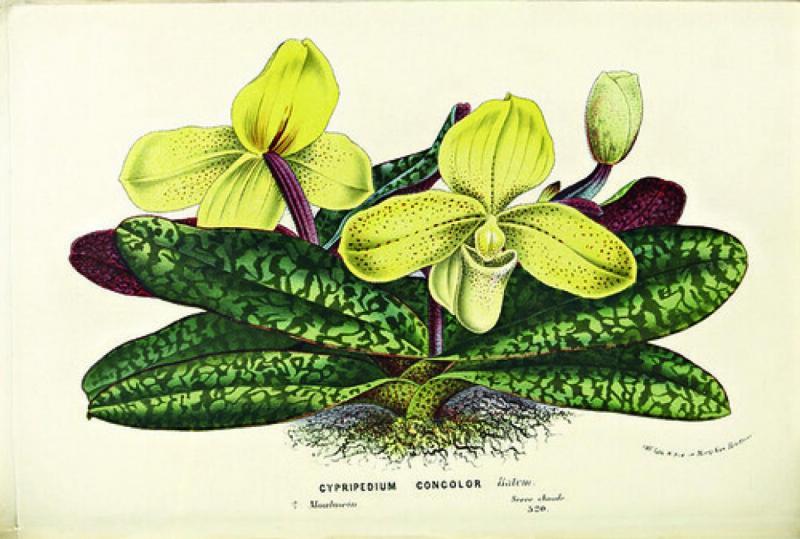 Cypripedium concolor is a warm growing orchid belonging to the sub family Cypripedioideae.