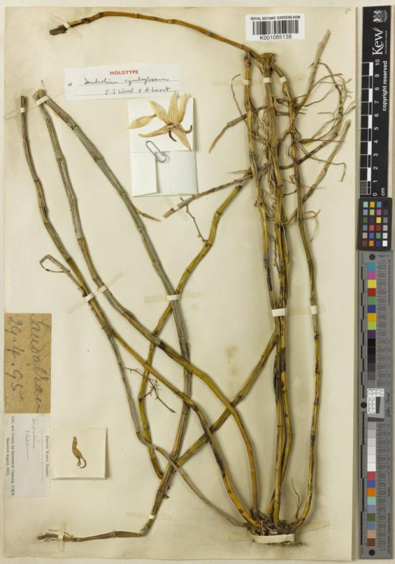 Sympodial. Grows to 30-100cm. Each new growth has numerous elliptic leaves that grow to 11-12cm long. Pseudobulbs grow to 30-100cm
