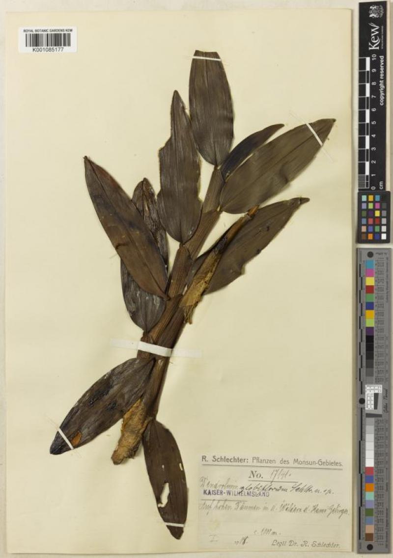 Sympodial. Grows to 90cm. Each new growth has numerous erect elliptic leaves that grow to 10-13cm long. Pseudobulbs grow to 90cm
