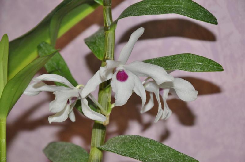 Sympodial. Grows to 30-60cm. Each new growth has numerous thick oblong shaped leaves that grow to 8-13cm long. Pseudobulbs grow to 30-90cm. The plant forms pendant or arching growths