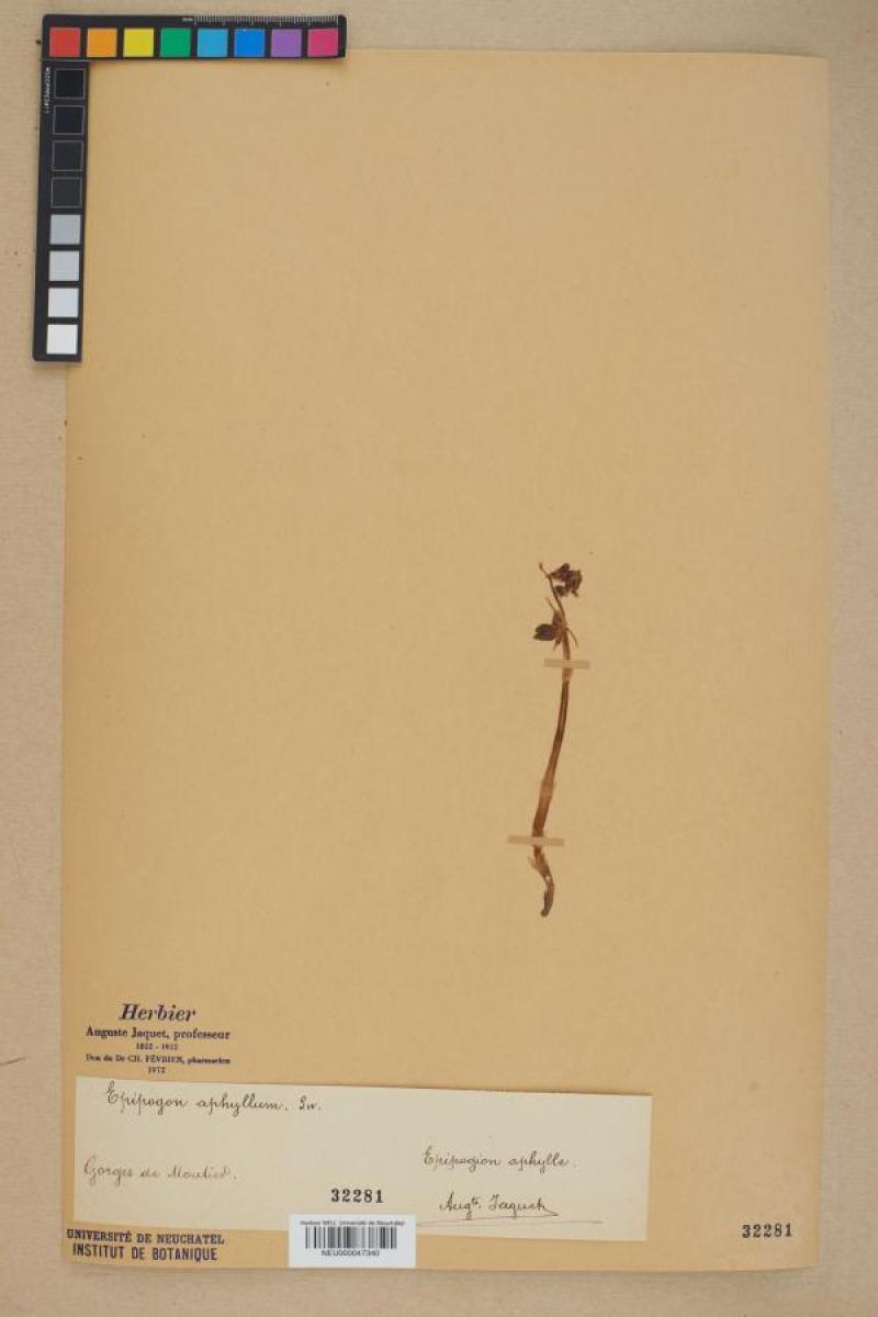 The Leafless Epipogium is a cold to cool growing terrestrial orchid belonging to the sub family Epidendroideae native to Austria, Belgium, Bhutan, Bulgaria, Denmark, Finland, France, Germany, Greece, Hungary, Italy, Japan, Norway, Pakistan, Poland, Romania, Spain, Sweden, Switzerland, Turkey, and Ukraine.
