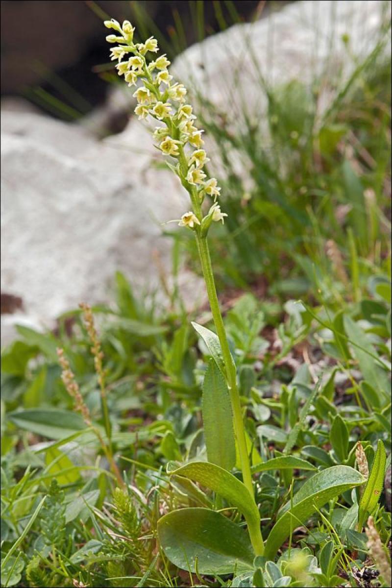 Leucorchis albida is a cold growing terrestrial orchid belonging to the sub family Orchidoideae.