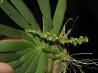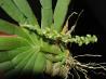 Monopodial. Each new growth has numerous rigid lance shaped, oblong shaped leaves