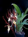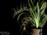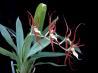 Sympodial. Grows to 68cm. Each new growth has a single erect arching, lance shaped leaf that grows to 3-60cm long. Pseudobulbs grow to 1.4-8cm. The plant forms clusters over time