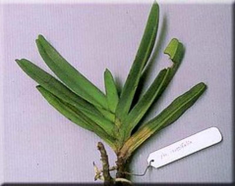 Monopodial. Grows to 15cm. Each new growth has numerous leathery thick, arching, rigid leaves that grow to 2.5-18cm long