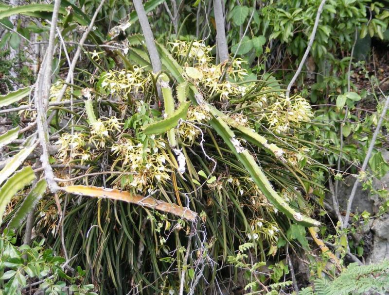 Sympodial. Grows to 20-38cm. Each new growth has numerous erect terete shaped leaves that grow to 1.3-38cm long. Pseudobulbs grow to 16cm