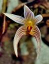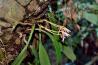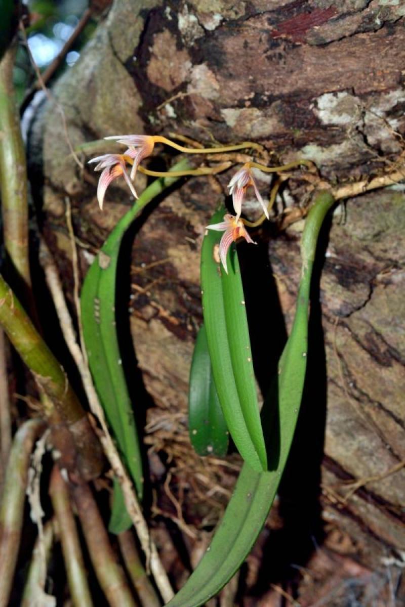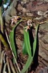 Grows to 3.5-26cm. Each new growth has a single elliptic oblong shaped leaf that grows to 0.8-26cm long. Pseudobulbs grow to 0.3-4cm. The plant tends to climb or sprawl with each new growth