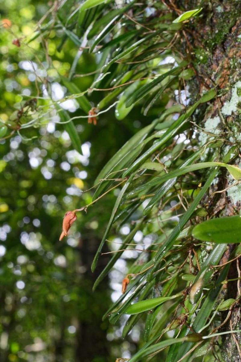Each new growth has a single erect lance shaped leaf. The plant tends to climb or sprawl with each new growth