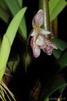 Each new growth has a single leathery erect, arching, oblong shaped leaf that grows to 0.3-13cm long. Pseudobulbs grow to 0.3-6cm. The plant tends to climb or sprawl with each new growth