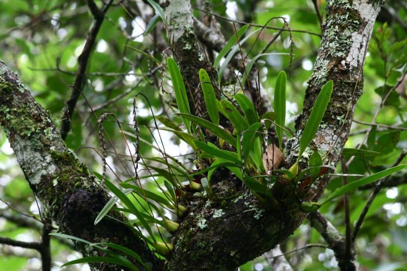 Sympodial. Grows to 1.5-12cm. Each new growth has a single leathery lance shaped, oblong shaped leaf that grows to 1-15cm long. Pseudobulbs grow to 1-1.5cm. The plant tends to climb or sprawl with each new growth and forms clusters over time