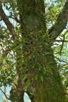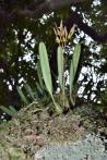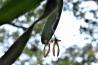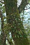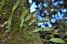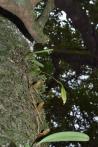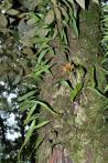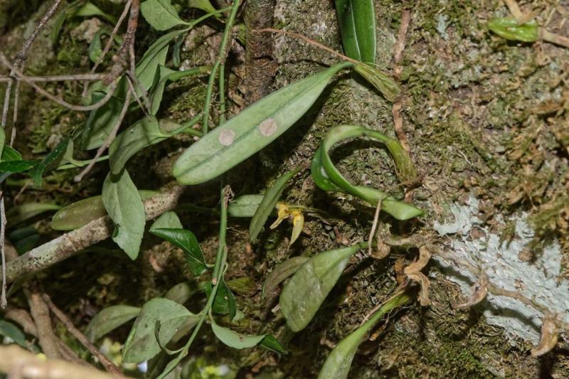 Each new growth has a single leathery thick, erect, oblong shaped leaf. The plant tends to climb or sprawl with each new growth