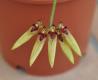 Each new growth has a single leathery oblong shaped leaf that grows to 1.7-12.5cm long. Pseudobulbs grow to 5-7.5cm