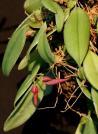 Grows to 0.2-10cm. Each new growth has a single leathery lance shaped leaf that grows to 1.5-9.5cm long. Pseudobulbs grow to 0.2-1.8cm. The plant tends to climb or sprawl with each new growth
