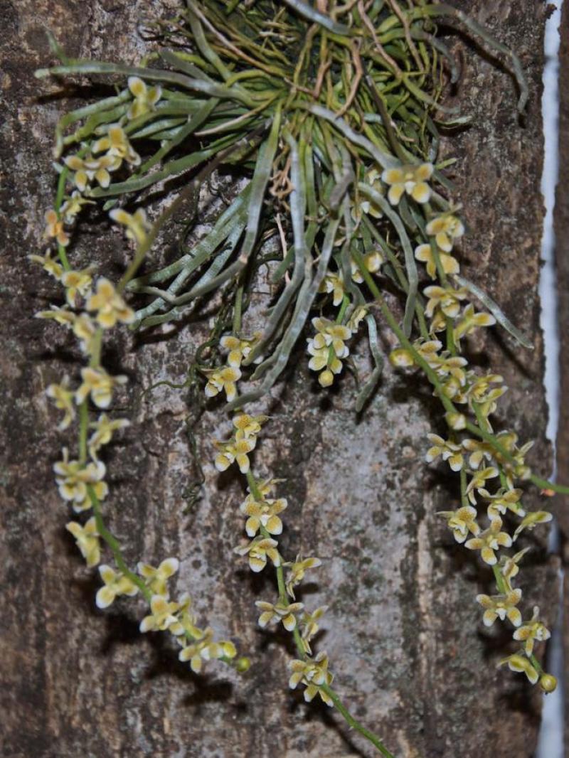 This orchid is leafless so does best mounted, watering daily during warmer months and not so often during the cool months. Keep humidity high at all times to prevent roots from dying back, and provide gentle airflow to ensure that the roots do not gather mould and rot in cool weather. Because of their velamin coating the roots can withstand plenty of light, however it's best to keep them in the shade during hot weather so that the roots do not overheat.