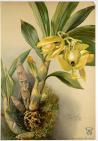 Sympodial. Grows to 30-50cm. Each new growth has numerous erect arching, elliptic, lance shaped, oblong shaped leaves that grow to 2.5-30cm long. Pseudobulbs grow to 20cm