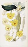 Sympodial. Grows to 30-75cm. Each new growth has numerous lance shaped oblong shaped leaves that grow to 5-10cm long. Pseudobulbs grow to 5-50cm. The plant forms pendant or arching growths