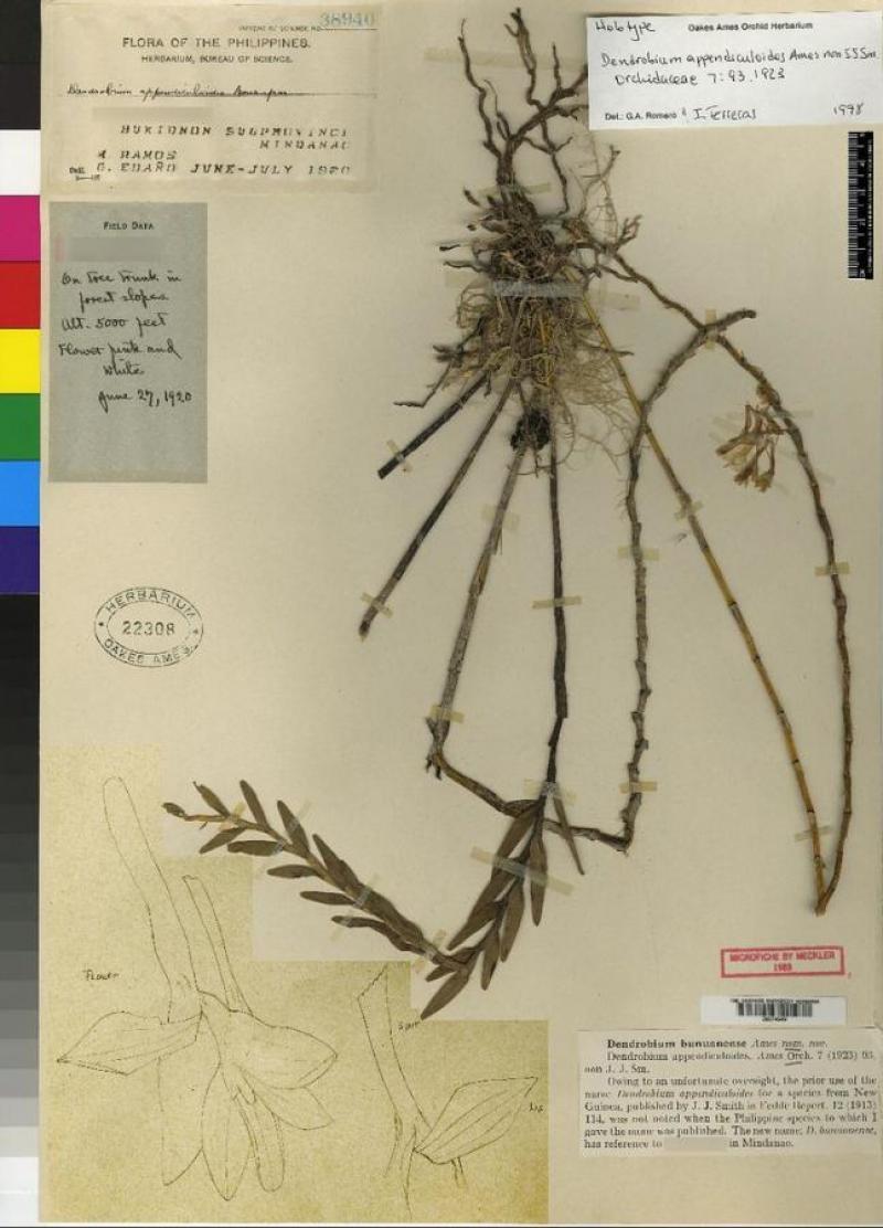 Also known as: The Bunuan Dendrobium or Dendrobium appendiculoides Eurycaulis appendiculoides in the subfamily: Epidendroideae