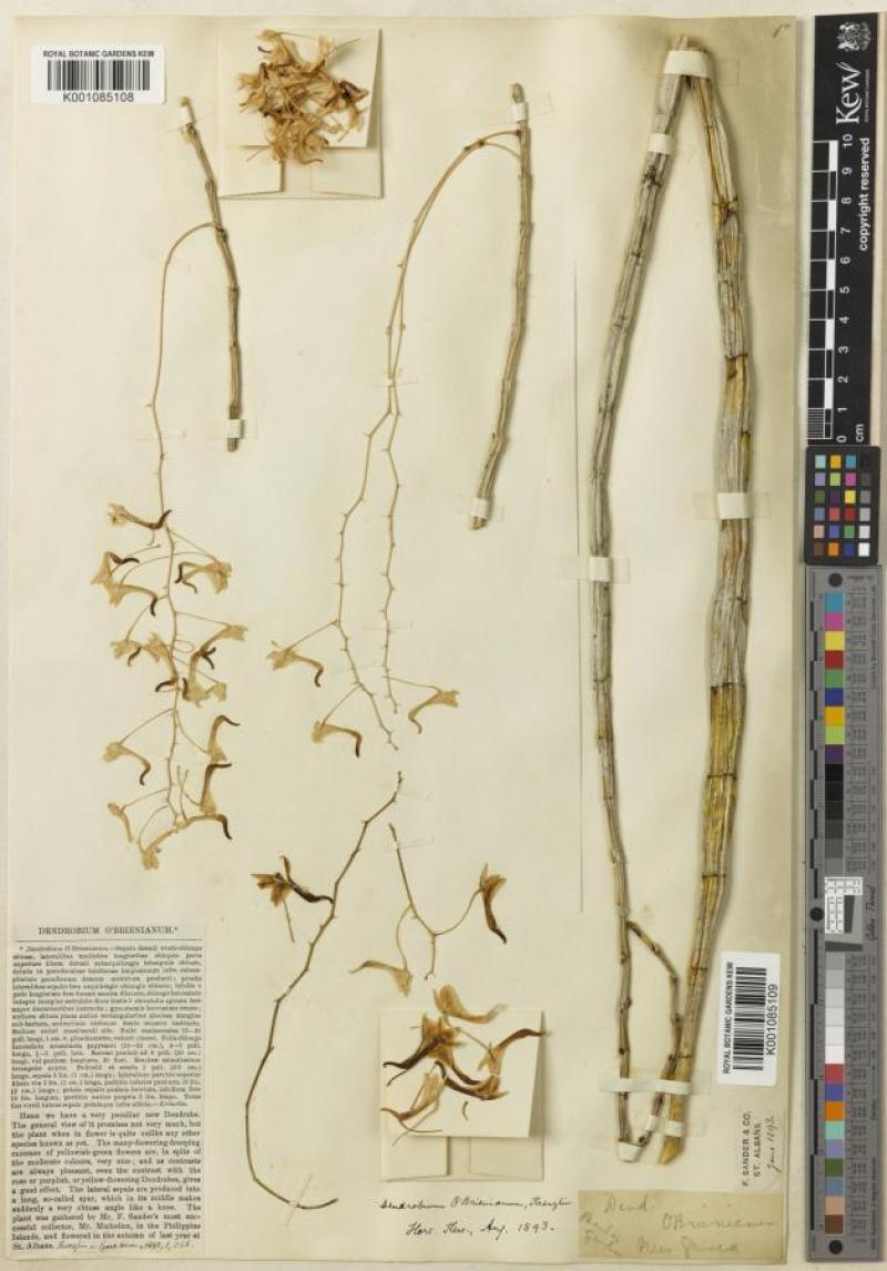 Sympodial. Grows to 28cm. Each new growth has numerous lance shaped leaves that grow to 8cm long. Pseudobulbs grow to 20cm. The plant forms pendant or arching growths