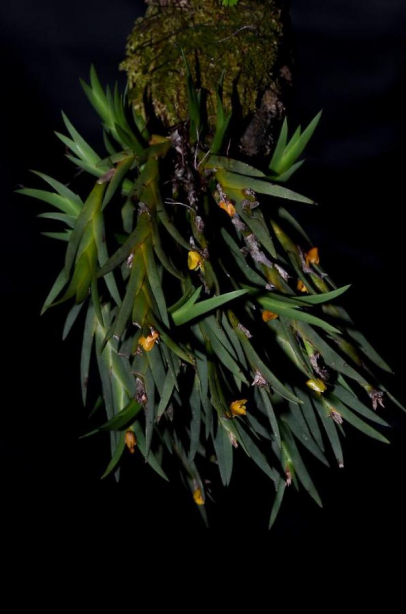 Sympodial. Grows to 10-20cm. Each new growth has numerous thick leaves that grow to 4cm long. Pseudobulbs grow to 1-20cm