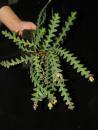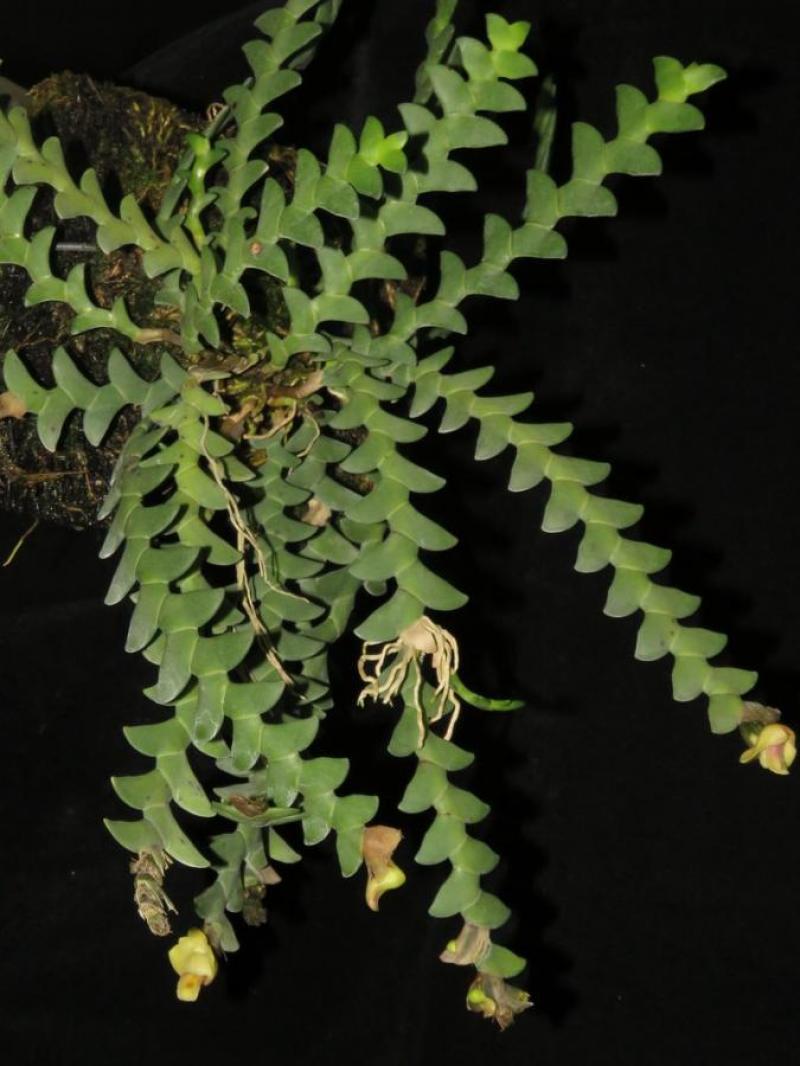 Sympodial. Grows to 10-25cm. Each new growth has numerous leaves that grow to 1.5-2.5cm long. Pseudobulbs grow to 10-23cm. The plant forms pendant or arching growths
