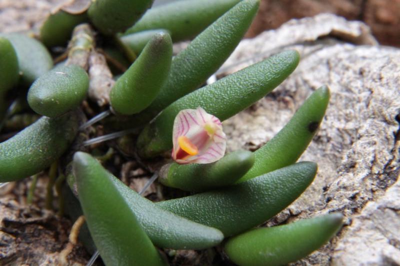 Sympodial. Grows to 2-6cm. Each new growth has numerous oblong shaped terete shaped leaves that grow to 1-6cm long. Pseudobulbs grow to 2-6cm. The plant tends to climb or sprawl with each new growth