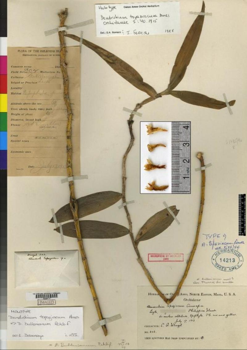 Dendrobium topaziacum is a medium sized warm to hot growing epiphytic orchid belonging to the sub family Epidendroideae.