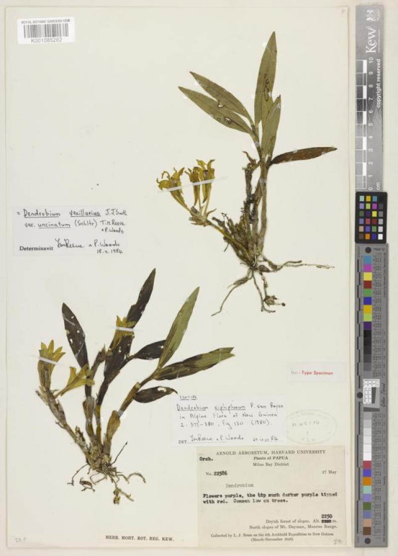 Dendrobium uncinatum is a cold growing epiphytic orchid belonging to the sub family Epidendroideae.