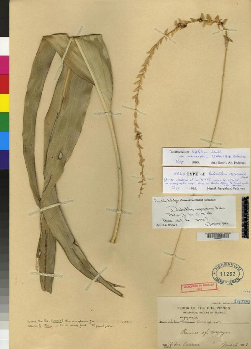 Dendrochilum cagayanense is a medium sized cool to hot growing epiphytic orchid belonging to the sub family Epidendroideae.