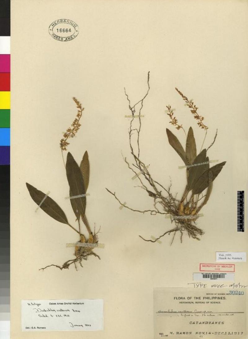 Dendrochilum ecallosum is an orchid belonging to the sub family Epidendroideae.