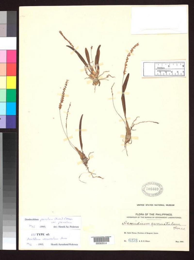 Also known as: The Small Flowered Dendrochilum or Acoridium strictiforme Acoridium venustulum Dendrochilum parvulum var. strictiforme Dendrochilum parvulum var. parvulum Dendrochilum venustulum Dendrochilum strictiforme in the subfamily: Epidendroideae