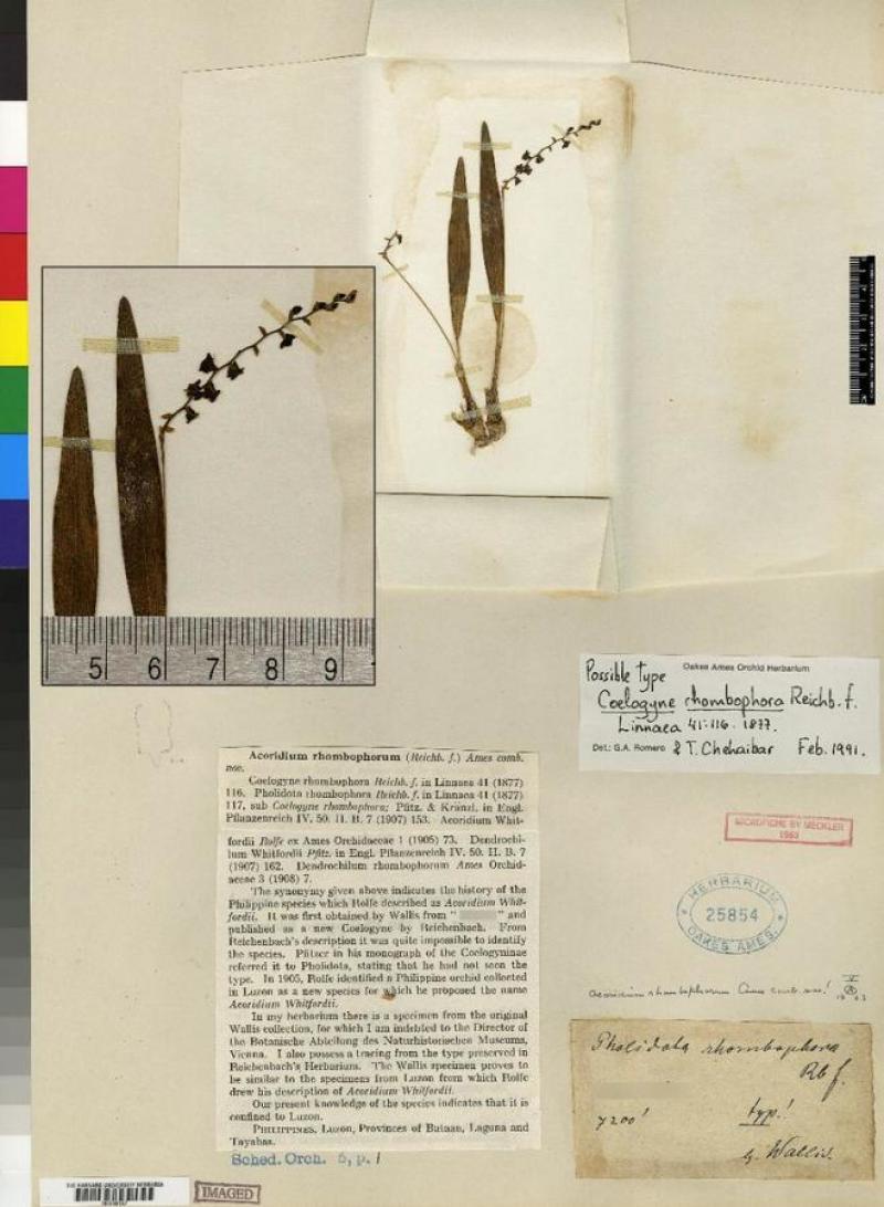 Also known as: The Oval Pseudobulb Dendrochilum or Pholidota rhombophora Acoridium whitfordii Coelogyne rhombophora Dendrochilum whitfordii in the subfamily: Epidendroideae