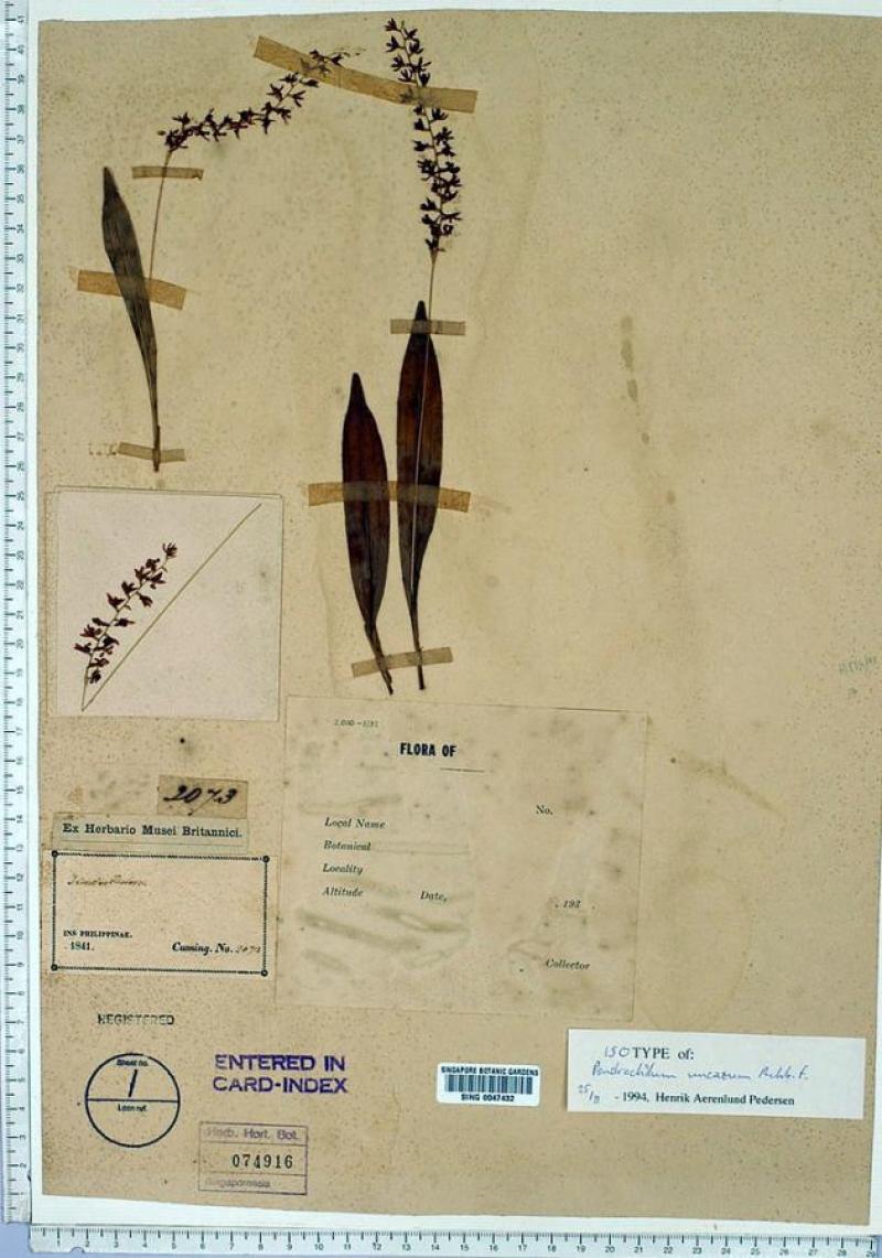 Also known as: Refers to the inward bent to the arms on the column or Platyclinis formosana Dendrochilum cucumerinum Acoridium cucumerinum Platyclinis uncata Dendrochilum longispicatum Dendrochilum uncatum var. formosanum Dendrochilum uncatum var. longispicatum Dendrochilum formosanum Dendrochilum uncatum var. uncatum The Hook-Shaped Dendrochilum in the subfamily: Epidendroideae