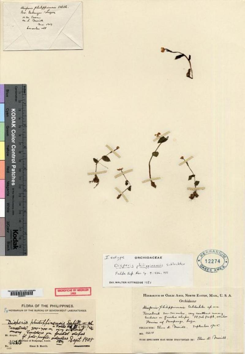 Disperis philippinensis is a warm to hot growing orchid belonging to the sub family Orchidoideae.
