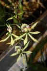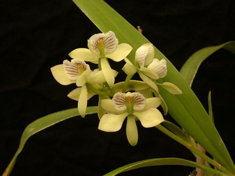 Sympodial. Grows to 40cm. Each new growth has a single leathery erect, arching, elliptic leaf that grows to 2-31cm long. Pseudobulbs grow to 0.25-11cm