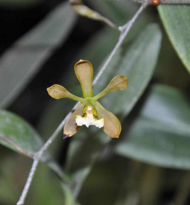 Sympodial. Grows to 45cm. Each new growth has numerous elliptic lance shaped leaves that grow to 0.8-38cm long. Pseudobulbs grow to 2-7cm. The plant forms clusters over time