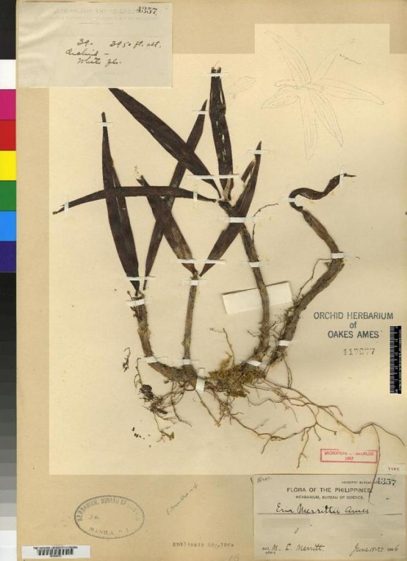 Eria merrittii is an orchid belonging to the sub family Epidendroideae.