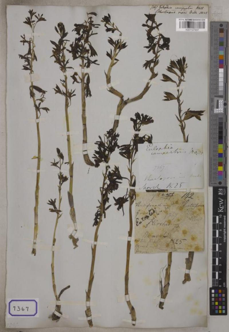 Eulophia campestris is a warm to hot growing orchid belonging to the sub family Epidendroideae.