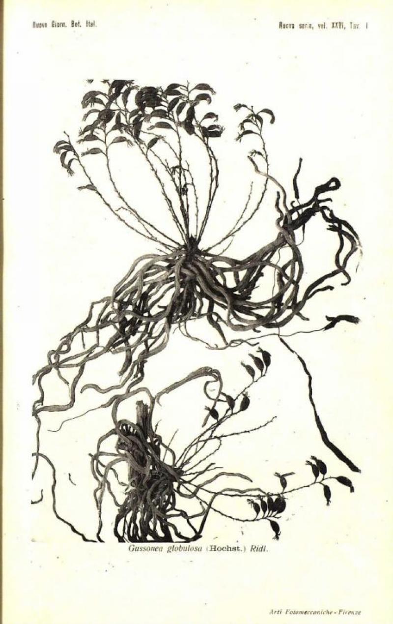 Gussonea globulosa is a medium sized warm to hot growing epiphytic orchid.