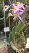 Sympodial. Grows to 4-7.5cm. Each new growth has a single thick erect leaf that grows to 2.5-4cm long. Pseudobulbs grow to 1-3.5cm