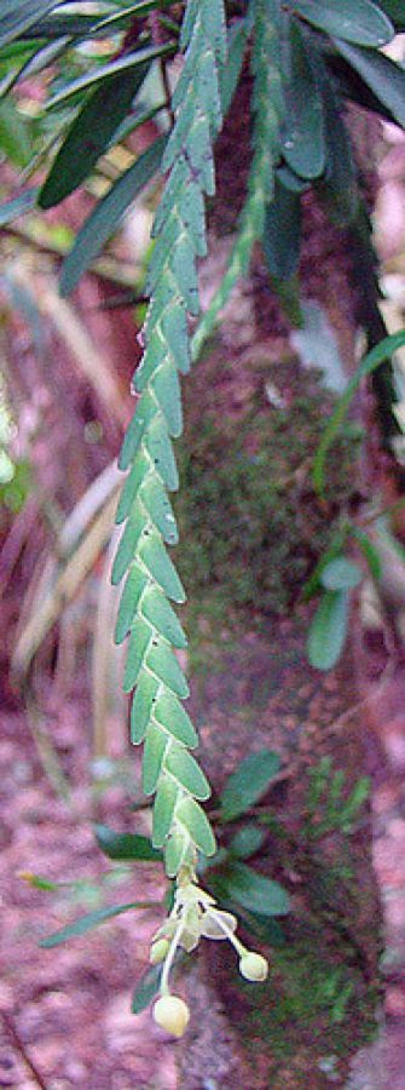 Sympodial. Grows to 50cm. Each new growth has numerous leathery thick leaves that grow to 0.4-3cm long. Pseudobulbs grow to 1-50cm