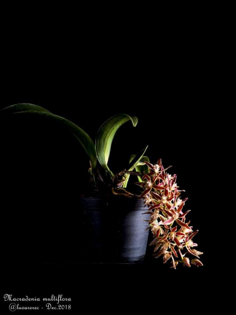 The Multiflowered Macradenia is a medium sized sympodial cool to warm growing epiphytic orchid belonging to the sub family Epidendroideae native to Brazil and Paraguay.
