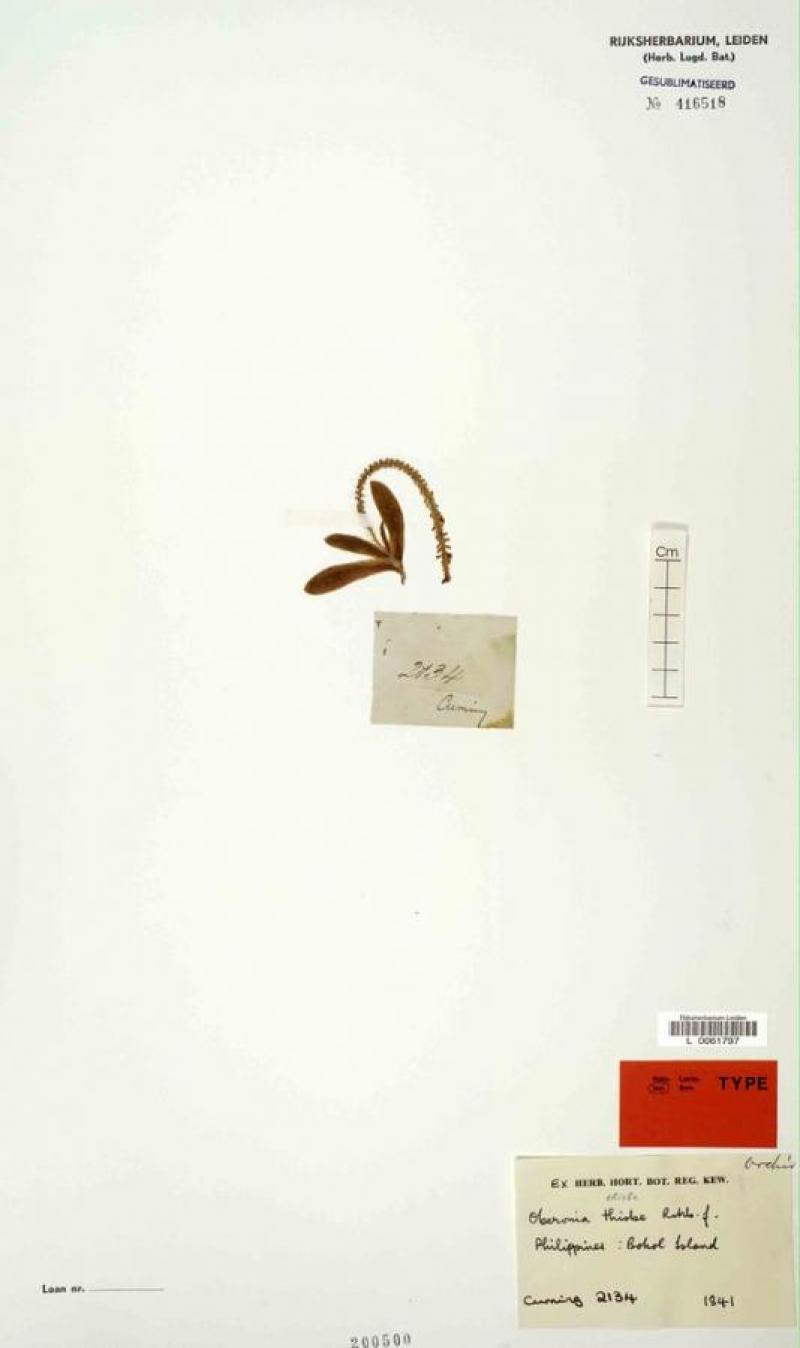 Oberonia thisbe is a cool to hot growing epiphytic orchid belonging to the sub family Epidendroideae.