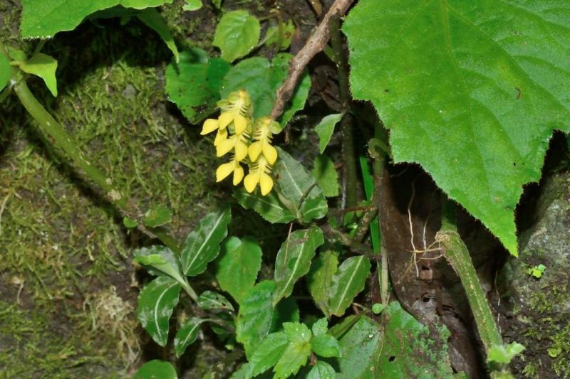 Odontochilus bisaccatus is an orchid belonging to the sub family Spiranthoideae.