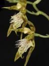 Sympodial. Grows to 20cm. Each new growth has a single erect lance shaped, oblong shaped leaf that grows to 1-18cm long. Pseudobulbs grow to 1.5-3cm. The plant forms clusters over time