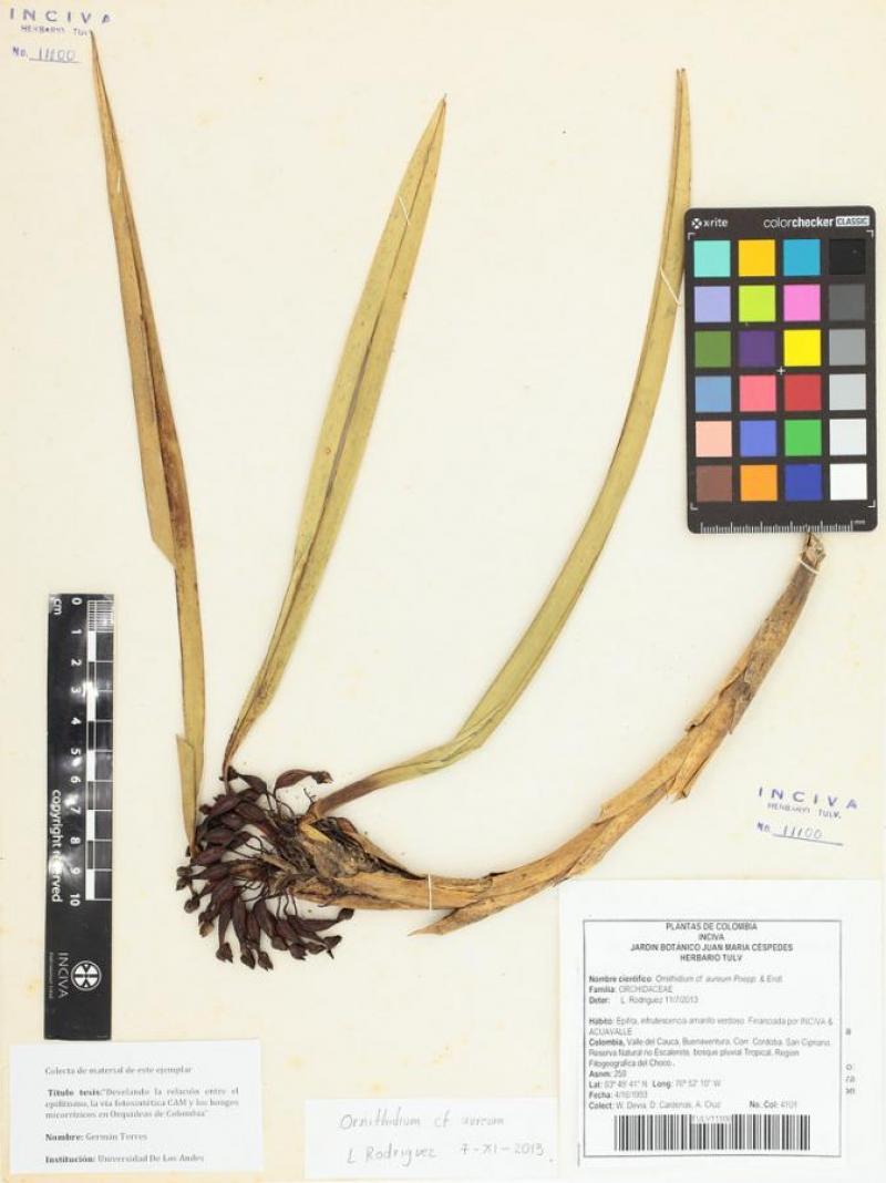 Ornithidium aureum is a cool growing epiphytic or terrestrial orchid belonging to the sub family Epidendroideae.