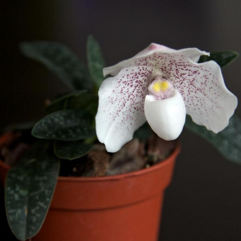 The Snow is a dwarf warm growing terrestrial orchid belonging to the sub family Cypripedioideae native to Singapore and Thailand.