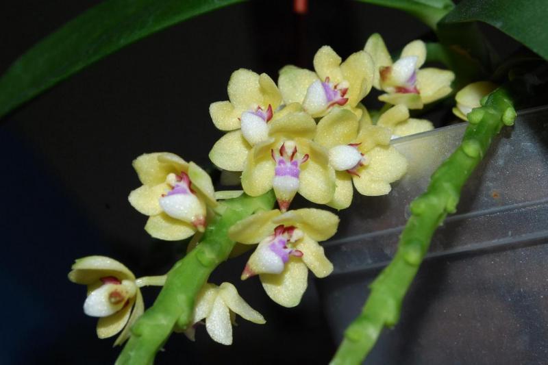 Monopodial. Grows to 16-30cm. Each new growth has numerous tongue shaped leaves that grow to 1.4-15cm long