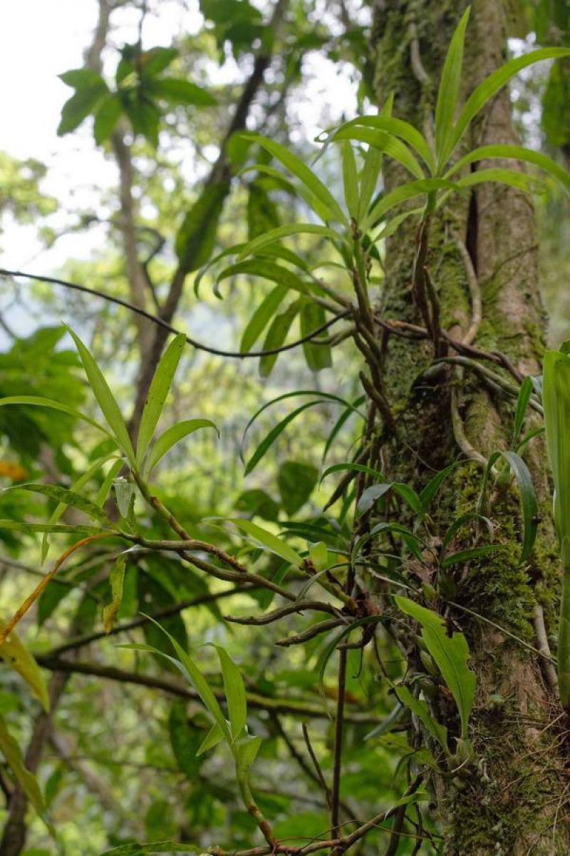 Sympodial. Grows to 6-25cm. Each new growth has numerous lance shaped leaves that grow to 10-25cm long. Pseudobulbs grow to 1.5-2.5cm. The plant tends to climb or sprawl with each new growth