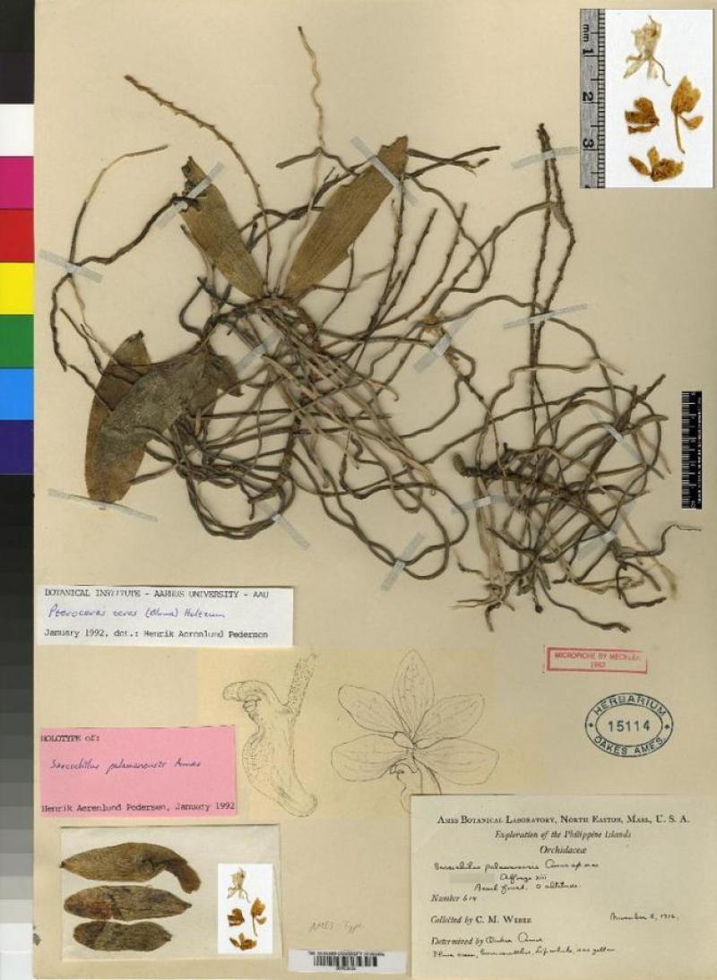 Also known as: The Terete Leafed Pteroceras or Pteroceras radicans Ornitharium striatulum Sarcochilus palawanensis Sarcochilus teres var. exinflatus Pteroceras suaveolens Sarcochilus suaveolens in the subfamily: Epidendroideae
