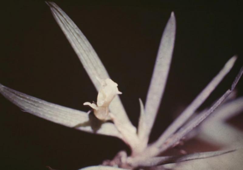 Sympodial. Grows to 4cm. Each new growth has a single leaf that grows to 0.3-3.5cm long. Pseudobulbs grow to 0.5cm
